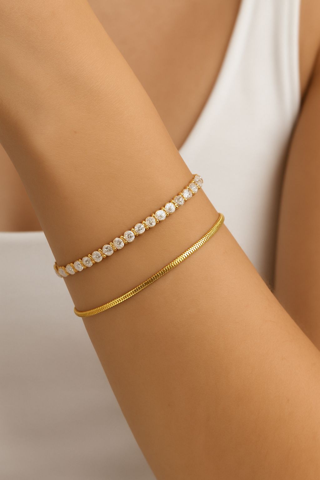 18K gold plated brass with crystal stones — waterproof, tarnish resistant, and designed to sparkle endlessly.